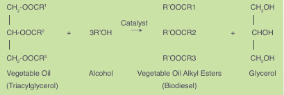 El biodiésel implica la adición de un grupo metilo o etilo a las cadenas alifáticas de los aceites vegetales o grasas animales, haciéndolos similares en propiedades al combustible diésel. Este proceso consiste en hacer reaccionar lípidos (como aceite vegetal, ácidos grasos, grasa animal y aceite de cocina usado) con un alcohol (metilo o etilo), dando como resultado la producción de ésteres de ácidos grasos.