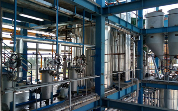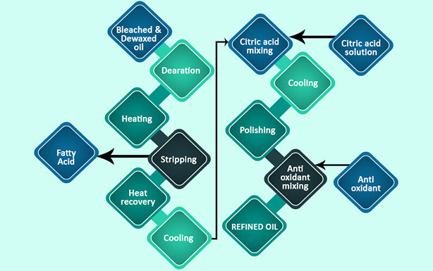 Deodorization helps in eliminating many off-flavors and off-colors in the feed. Deacidification-cum-Deodorization is carried out at 230 – 250°C under a high vacuum of the order of 1.5 torr with sparging steam for about 60 minutes. This makes the oil free from odoriferous compounds and free fatty acids.