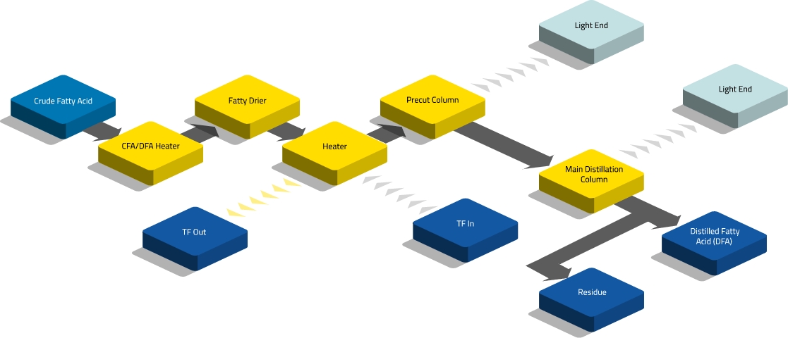 Estas secciones principales del proceso están respaldadas por un sistema de agua termostatizada que proporciona enfriamiento óptimo en la planta de destilación fraccionada de ácidos grasos. Los ácidos grasos crudos provenientes del límite de batería se filtran, se precalientan y se introducen en la unidad de desgasificación que funciona al vacío, donde se secan y desgasifican.