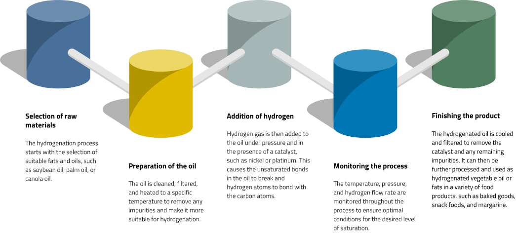 La hidrogenación de los aceites vegetales/ácidos grasos involucra la adición de hidrógeno, en presencia de un catalizador de níquel, a los dobles enlaces carbono-carbono presentes en las cadenas de ácidos grasos.