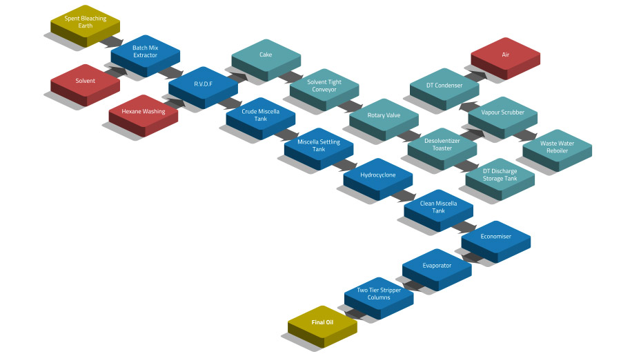 El proceso típico de refinado físico de aceites vegetales incluye el desgomado de aceites vegetales crudos, como el aceite de palma, para eliminar gomas y fosfátidos mediante hidratación con ácido fosfórico, que posteriormente se separan en forma de jabón (soapstock). Este tratamiento reduce el contenido de fosfátidos en el aceite hasta aproximadamente 20 ppm. Posteriormente, el aceite se blanquea con tierras activadas con el fin de reducir su color y, lo que es más importante, eliminar peróxidos, gomas residuales y jabones que aún permanecen a pesar de las etapas de separación previas. En industrias como la refinación de aceite de palma crudo, se generan grandes cantidades de tierras de blanqueo usadas, lo que crea una necesidad significativa de recuperar el aceite contenido en dichas tierras de forma económica.
